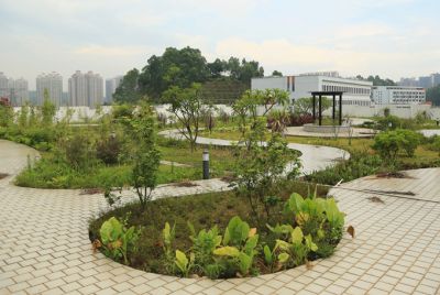 作為深圳市綠色建筑的示范工程,深圳高級技工學校新校區的建設大量應用了節能、節水、節材和環境保護等技術措施,其中包括屋頂花園的建設。其厚厚的種植土層可以有效隔絕室外的噪音和振動對教室的影響,同時起到隔熱和過濾收集屋頂雨水的作用。大面積的屋頂花園成為教學樓和生活區之間的活動場所,彌補了校園內稀缺的平面活動場所。